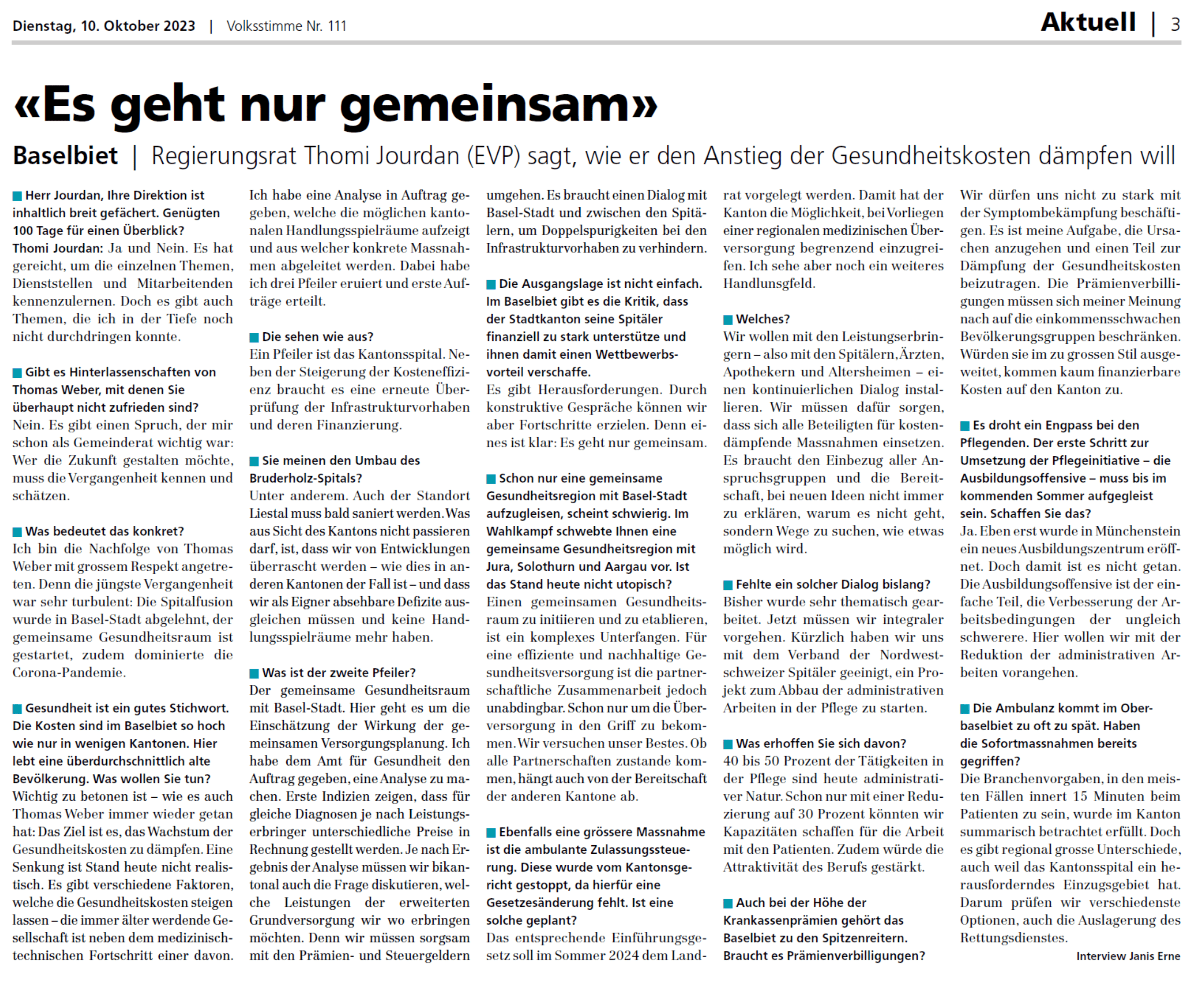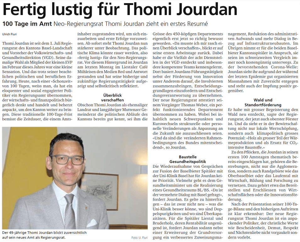 Letzten Sonntag war mein hundertster Tag als Regierungsrat. Ich bin begeistert über die Vielfalt der Aufgaben, sehe die spannenden Herausforderungen und bin dankbar mit einem tollen Team unterwegs sein zu dürfen. Für gestern wurden die Medien zu einem «Kaminfeuergespräch» eingeladen. Statt einer klassischen Medienkonferenz hatten die Medien die Gelegenheit, mich während je 45 Minuten zu meinen ersten 100 Tagen im Amt zu befragen. Nachfolgend der Medienspiegel.