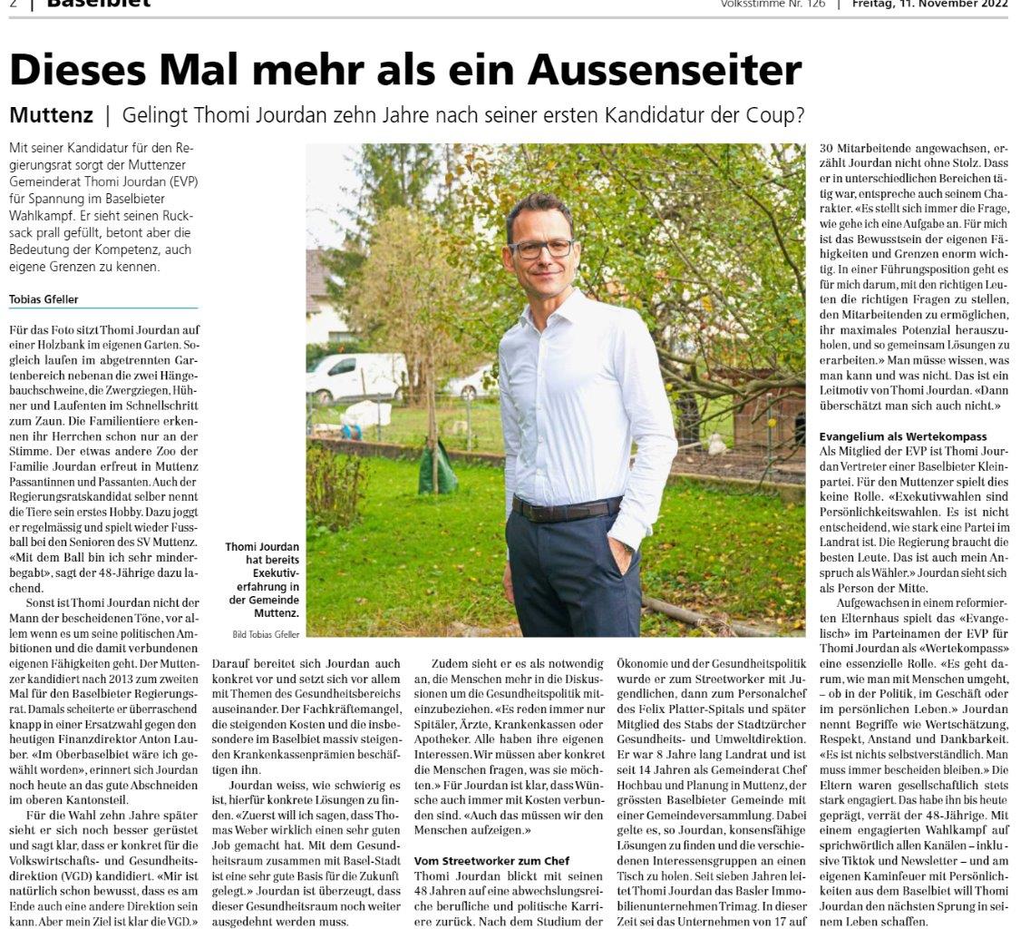 „Dieses Mal mehr als ein Aussenseiter.“ Mit diesem Titel beginnt das Portrait der Volksstimme zu meiner Kandidatur. Der Schlusssatz des Textes beschreibt meine Kampagne m.E. sehr stimmig: „Mit einem engagierten Wahlkampf auf sprichwörtlich allen Kanälen und am eigenen Kaminfeuer mit Persönlichkeiten aus dem Baselbiet will Thomi Jourdan den nächsten Sprung in seinem Leben schaffen.“